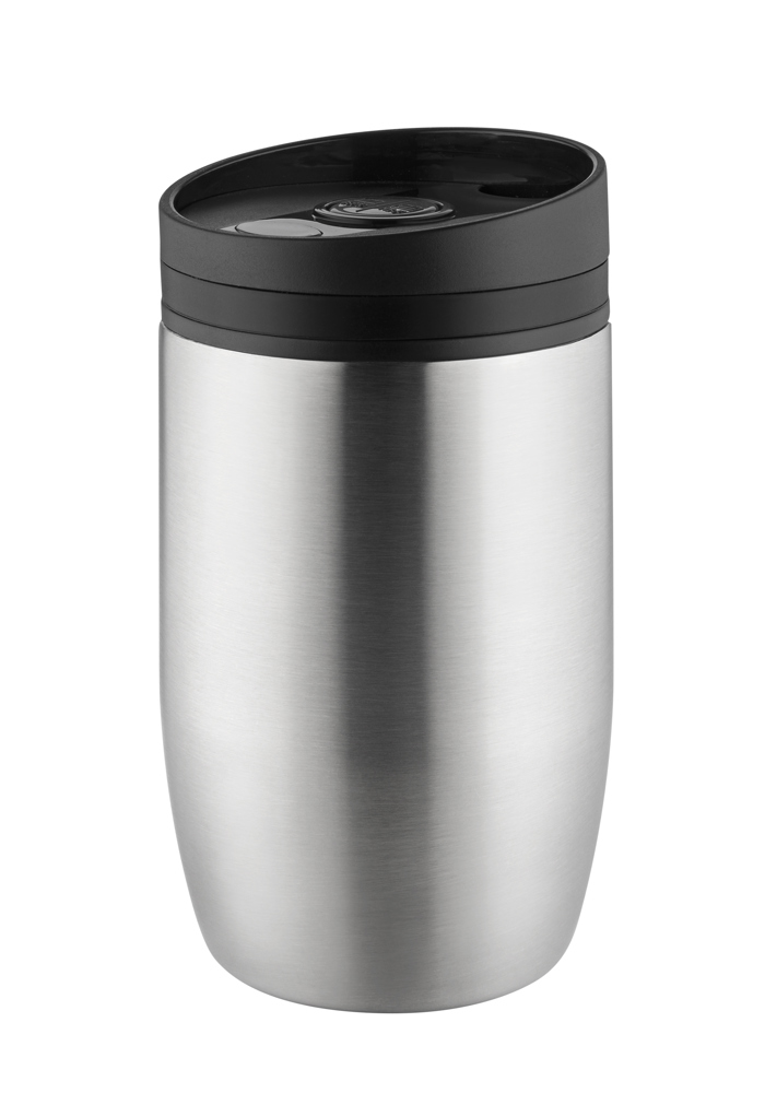 Trendiger Refill Thermobecher für das Office, unter der Kaffeemaschine, Zuhause oder das Auto/Mobil - doppelwandige Qualitätsstahlausführung, auslaufgeschützt und spülmaschinengeeignet zum Top attraktiven Preis. 350ml (0,35l), auslaufsicher, LFGB-konform. VPE 25, RCS-konformer Edelstahl - Recycling Anteil 61%, Craft Paper Box.