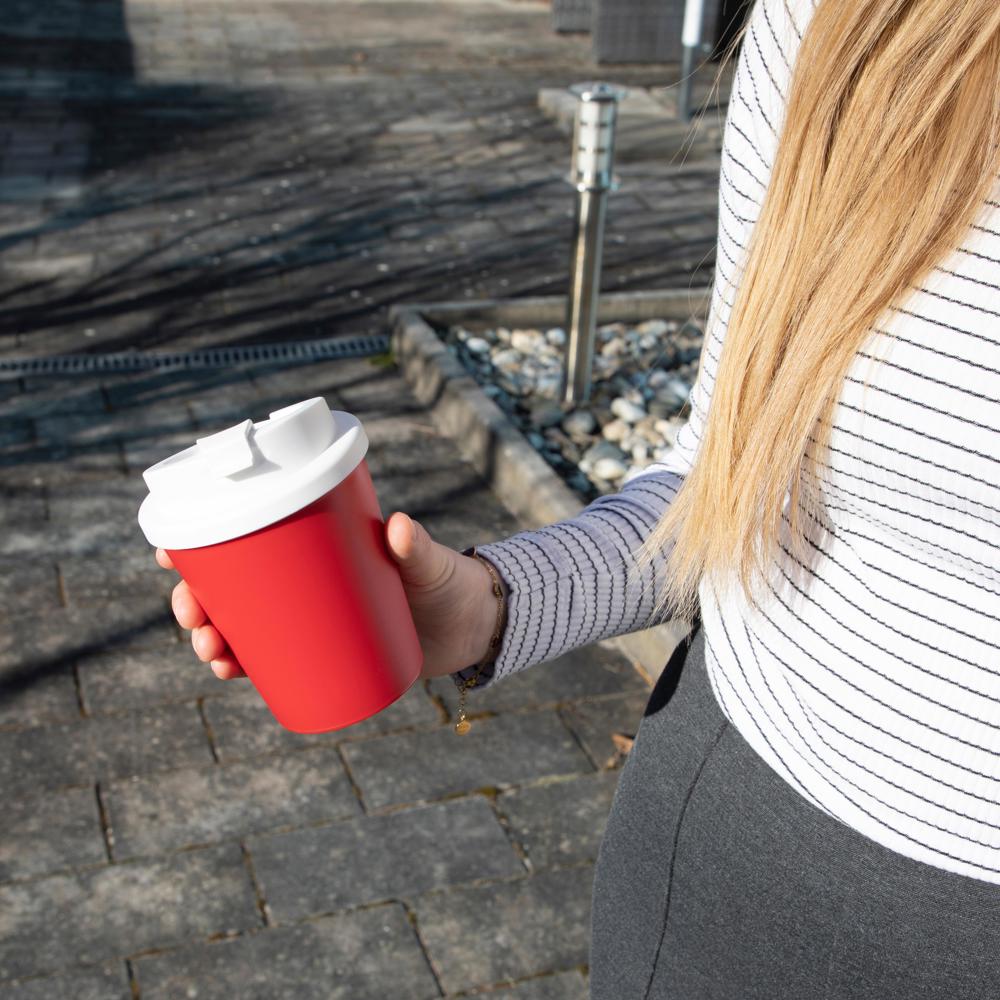Doppelwandiger Thermobecher mit verschraubbarem Deckel und innovativem 2K-Verschluss gegen das ungewollte Auslaufen des Kaffees. Füllmenge: 0,25 Liter.
