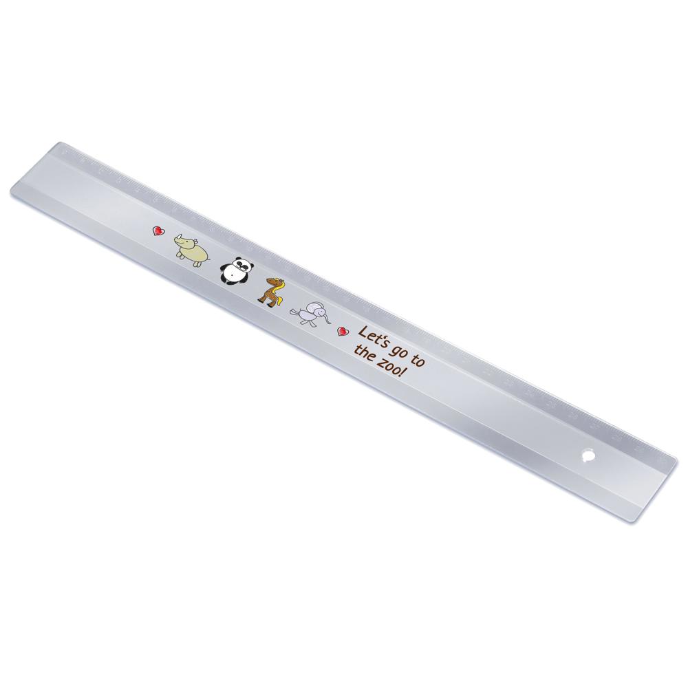 Stabiles 30 cm langes Lineal aus Kunststoff mit erhaben geprägter mm-Skala auf einer Seite. Standardmäßig ohne Druck. Loch auf einer Seite.