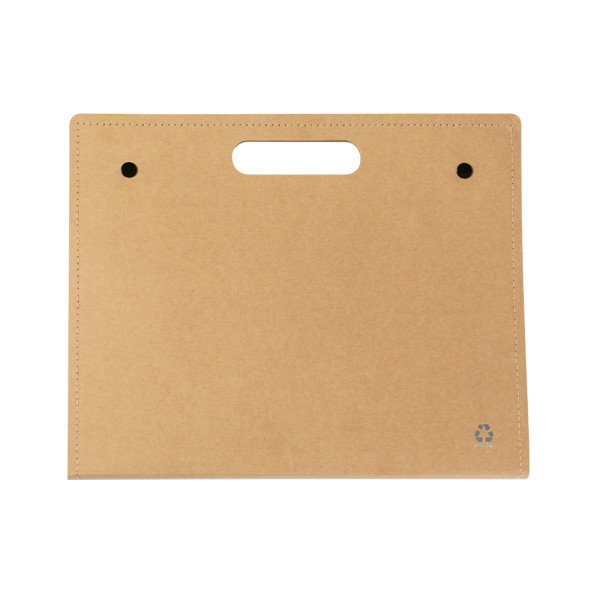 Ökologische Mappe mit zweifachem Druckknopfverschluss aus flexiblem Recyclingkarton und praktischem, integriertem Griff. Mit herausnehmbarem Block mit 25 linierten Blättern, 25 großen Haftnotizen und 125 Mini-Haftnotizen sowie Klappentasche und Kugelschreiberhalter.