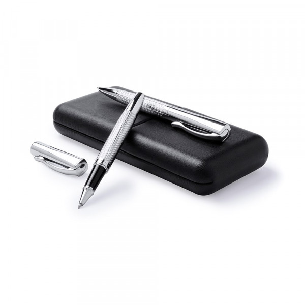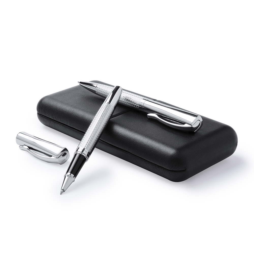 Elegantes Set aus Dreh-Kugelschreiber und Tintenroller mit schlichtem Design. Rutschfester Metallschaft in glänzendem Silber mit farblich passendem Clip. Präsentiert in einer eleganten Schachtel aus schwarzem Kunstleder, mit Innenraum aus weichem Wildleder in Weiß. Jumbo-Patrone mit blauer Tinte von deutscher Qualität.