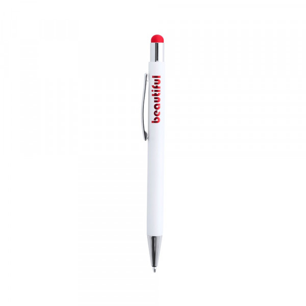 Druck-Kugelschreiber mit Stylus aus Aluminium in einem eleganten, matten Weiß. Mit Stylus in einer Vielzahl von Farben - farblich passend zum Interieur - und verchromten Kontrastdetails. Mit Außenbeschichtung, die speziell für die Lasermarkierung entwickelt wurde, so dass Ihr Logo in der Farbe des Interieurs graviert wird. Jumbo-Patrone mit blauer Tinte.