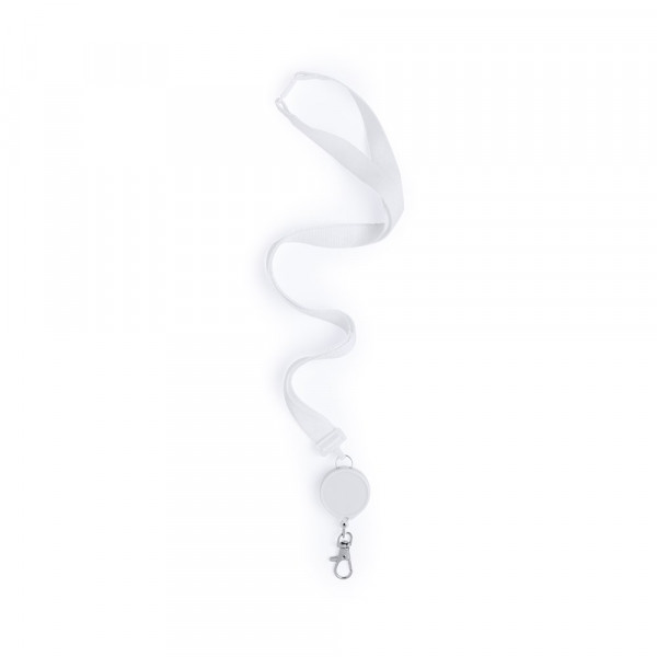 Praktischer Lanyard aus Polyester. Mit Sicherheitsverschluss im Nacken, ausziehbarem Zubehör und Metallkarabiner sowie Clip und Druckfläche für das Logo. Erhältlich in Schwarz und Weiß.