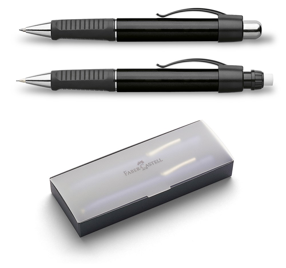 extra dicker Schaft in Schwarz. Druckbleistift mit federnd gelagerter 0,7 mm Mine, langer Radierer zum Herausdrehen. Kugelschreiber mit blau schreibender Mine. Eingelegt in eine schwarze Kartonage mit transluzentem Deckel.
