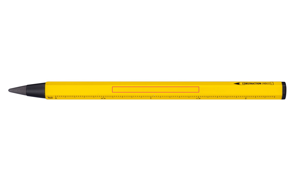 Multitasking-Bleistift mit nachhaltiger Endlos-Schreibspitze (ca. 20km Schreiblänge), HB, radierbar, ohne Anspitzen, Zentimeter-/Zoll-Lineal, 1:20/1:50 Skala, Schreibspitze austauschbar, Aluminium, Metall, matt, gelb