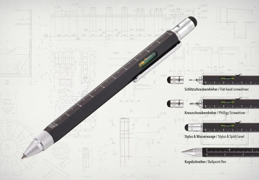 Multitasking-Kugelschreiber, Zentimeter-/Zoll-Lineal, 1:20/1:50 Skala, Wasserwaage,... mehr