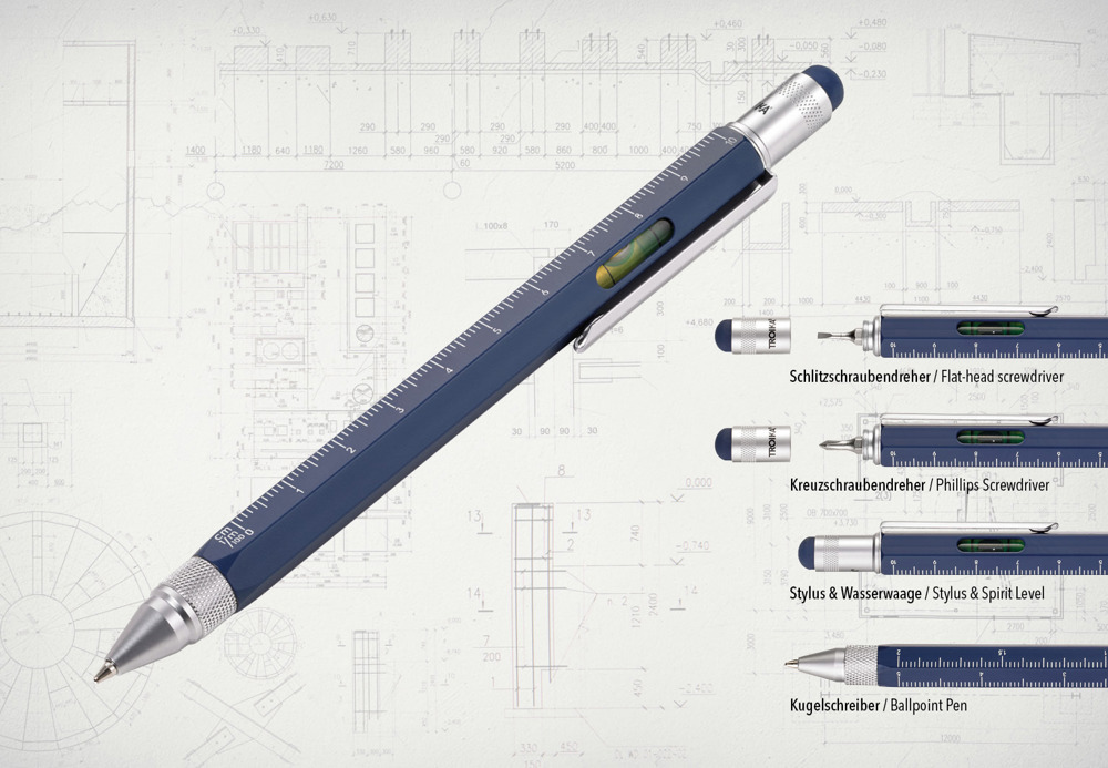 Multitasking-Kugelschreiber, Zentimeter-/Zoll-Lineal, 1:20/1:50 Skala, Wasserwaage, Schlitz-/Kreuzschraubendreher, Stylus, schwarze Mine, Messing, lackiert, blau/silberfarben