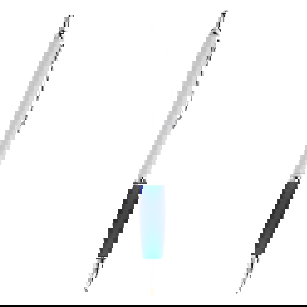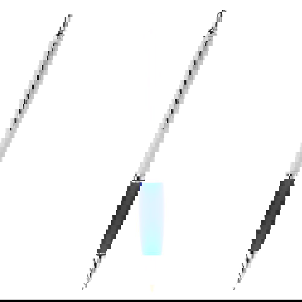 Weißer Kugelschreiber mit Metallclip, metallisierter Drücker, Ring und Spitze. Blauschreibende... mehr