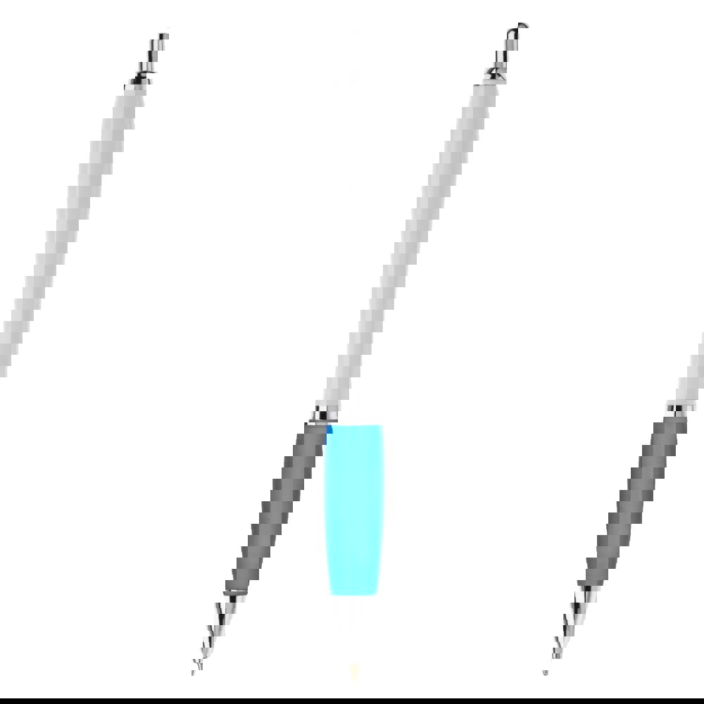 Weißer Kugelschreiber mit Metallclip, metallisierter Drücker, Ring und Spitze. Blauschreibende Jumbo-Mine.