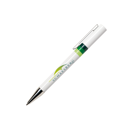 ETHIC ET900 MULTICOLOUR Kugelschreiber Maxema, glänzende Flächen, deckende Farben, Gehäuse und Kappe in Weiß, Clip aus Metall, Ringe dreifarbig, Spitze verchromt, blauschreibend
