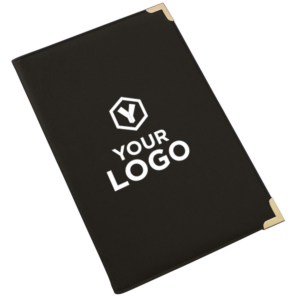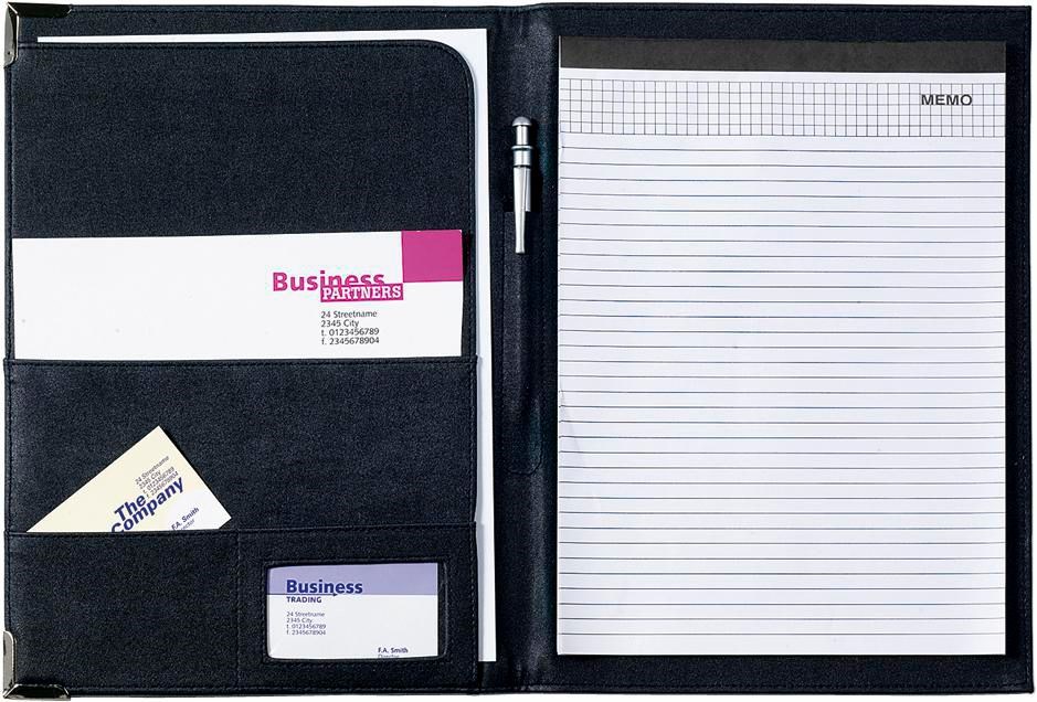 PU-Dokumentenmappe (A4) mit Metallecken und verschiedenen Fächern, ohne Schreibblock und Stift. Die blaue Version hat silberne, die schwarze Version goldene Ecken.