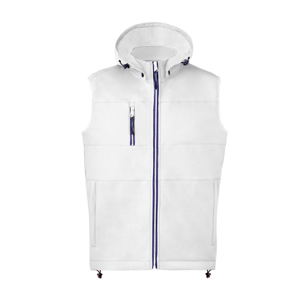Weste aus strapazierfähigem und atmungsaktivem 300g/m2 Softshell-Material. Moderner Schnitt, mit zentralem Reißverschluss, Seitentaschen und praktischer Brusttasche mit Reißverschlüssen und kontrastfarbenen Zippern. Stehkragen mit verstellbarer und abnehmbarer Kapuze. Unterer Saum mit verstellbarem Kordelzug. Wind- und wasserabweisendes Softshell-Außenmaterial und warmes Mikrofleece-Futter in Kontrastfarbe. Erhältlich in den Größen XS, S, M, L, XL, XXL.