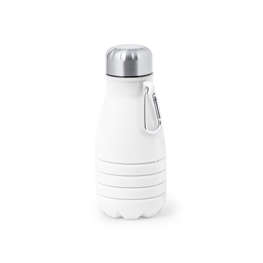 Faltbare Flasche mit einem Fassungsvermögen von 550 ml. Hergestellt aus hochwertigem Silikon mit Edelstahlkappe. Mit einem flexiblen, mattierten Körper kann dieser Kanister für eine einfache und bequeme Aufbewahrung gefaltet werden. Inklusive Karabinerhaken für einfaches Tragen. BPA-frei. Es ist ideal für Ihren Schreibtisch, Tisch oder jede andere Oberfläche, auf der Sie in Ruhe Ihr Lieblingsgetränk genießen können. Maße zusammengeklappt: Ø7,1 cm x 16,9 cm hoch. Maße ausgeklappt Ø7,1 cm bis 24,8 cm hoch.