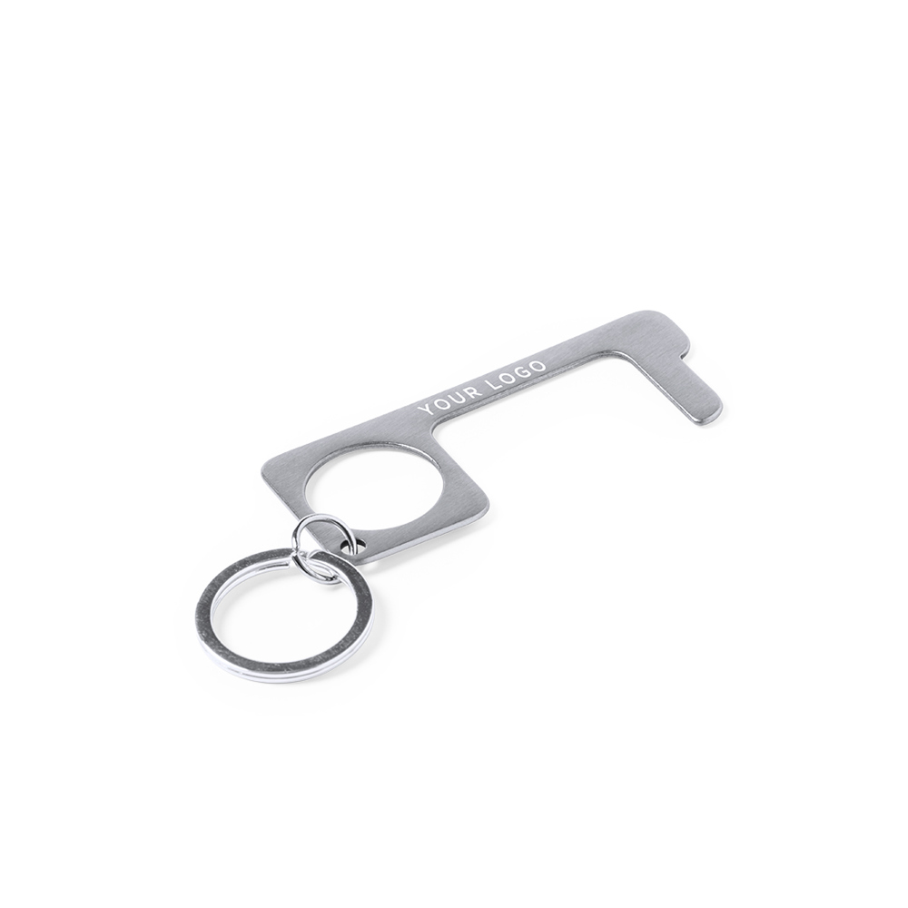 Hygienischer, berührungssicherer Sicherheitsschlüsselanhänger aus widerstandsfähigem Edelstahl. Speziell entwickelt, um das Berühren von Oberflächen im öffentlichen Bereich mit den Händen zu vermeiden (Türgriffe, Schalter, Wasserhähne im öffentlichen Bereich, Geldautomaten...). Mit komfortablem Ausschnitt für den Finger und in einer individuellen Tasche präsentiert. Empfohlen für Laserdruck.