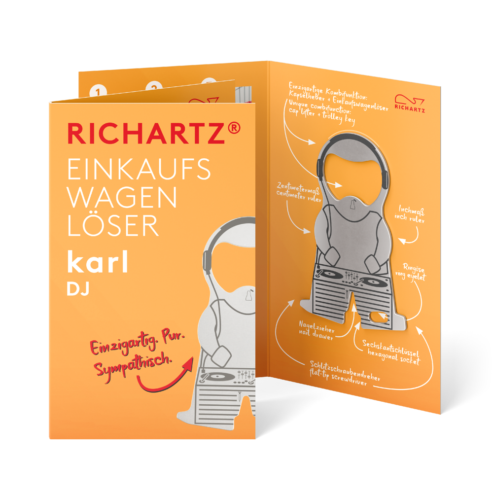 Der RICHARTZ® EINKAUFSWAGENLÖSER karl dj ist der sympathische Werbeträger für Marken und Unternehmen. Mit einer individuellen Lasergravur und individuell gestalteter 4-seitigen Verpackung in 4c, werben Marken aufmerksamkeitsstark und aussagekräftig!