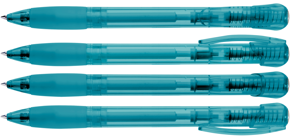 Druckkugelschreiber mit transparent glänzendem Gehäuse, Gummigriffzone und Clipdrücker. Stopfen... mehr