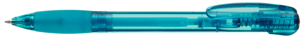 Druckkugelschreiber mit transparent glänzendem Gehäuse, Gummigriffzone und Clipdrücker. Stopfen silber metallic.