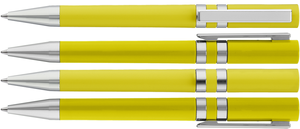 Drehkugelschreiber mit gedeckt glänzendem Gehäuse. Eingelassene Ringe, Stopfen im Oberteil, Metallclip und Spitze in silber glänzend.