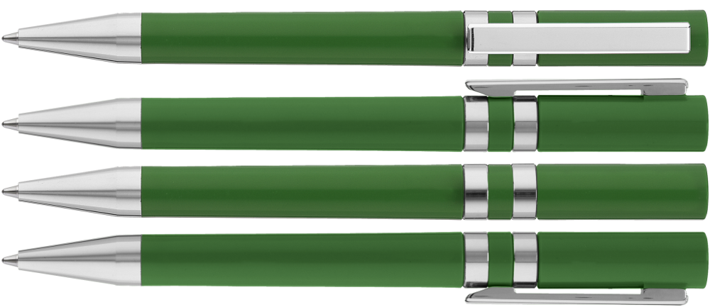 Drehkugelschreiber mit gedeckt glänzendem Gehäuse. Eingelassene Ringe, Stopfen im Oberteil, Metallclip und Spitze in silber glänzend.