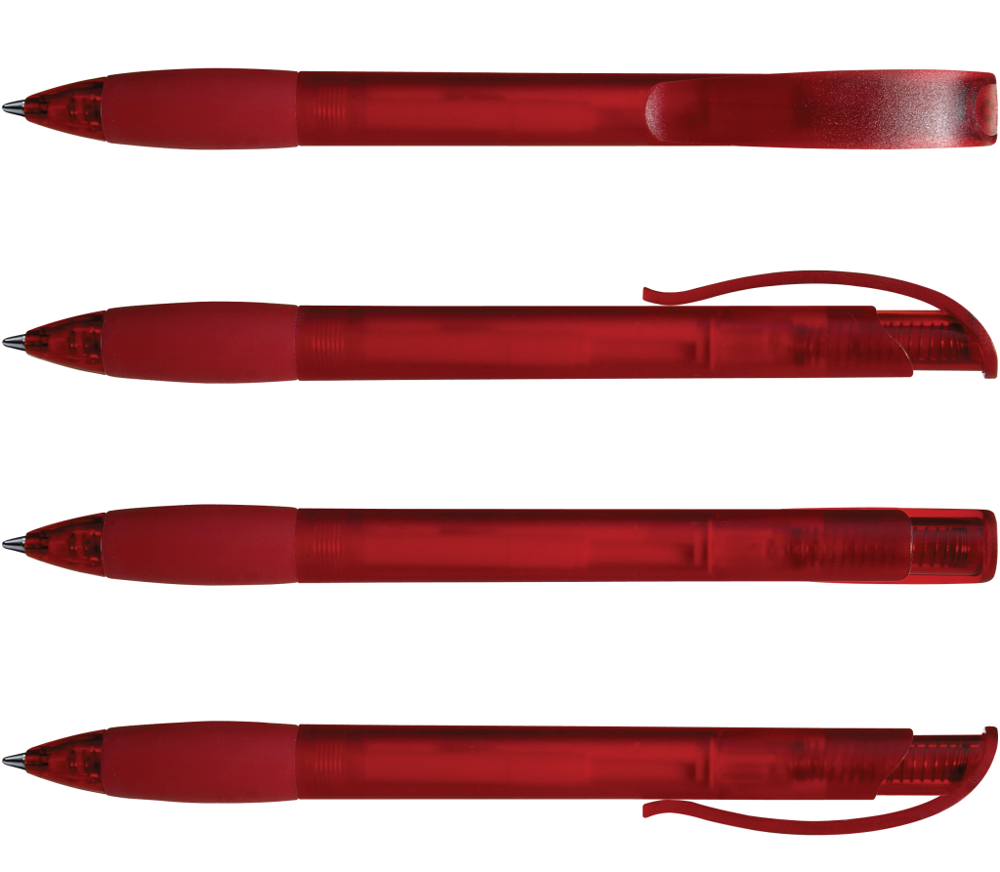Druckkugelschreiber mit transparent gefrostetem Gehäuse, Gummigriffzone und Clipdrücker mit Stopfen.