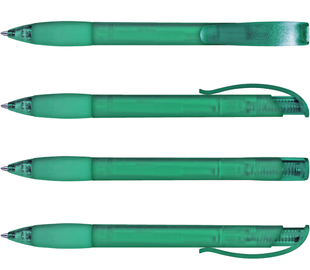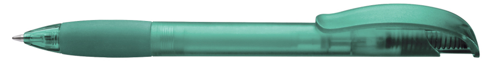 Druckkugelschreiber mit transparent gefrostetem Gehäuse, Gummigriffzone und Clipdrücker mit Stopfen.