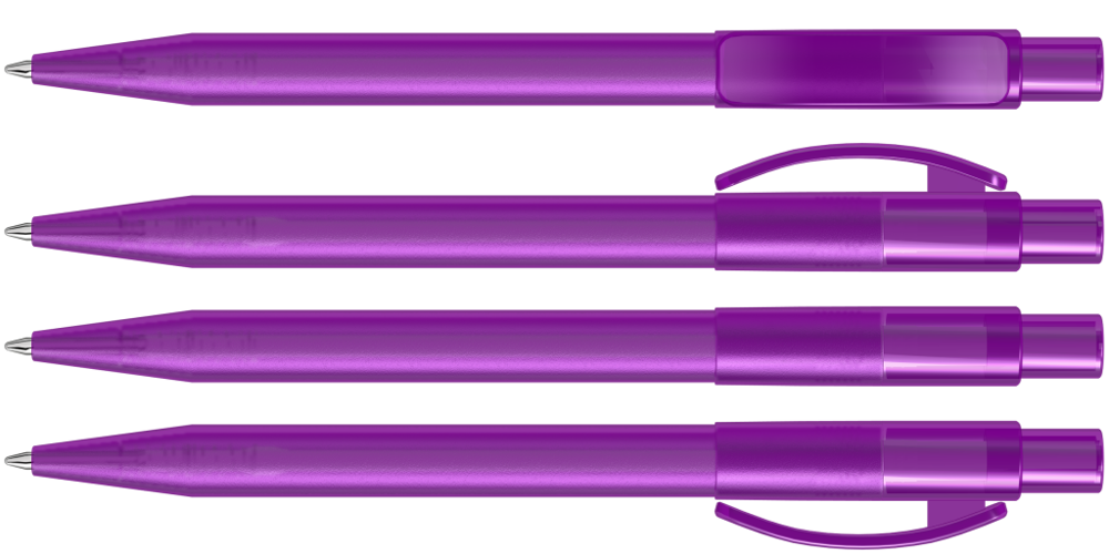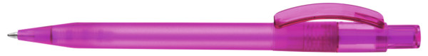 Druckkugelschreiber mit gefrostetem Gehäuse, glänzend transparentem Bogenclip und Drücker. mehr