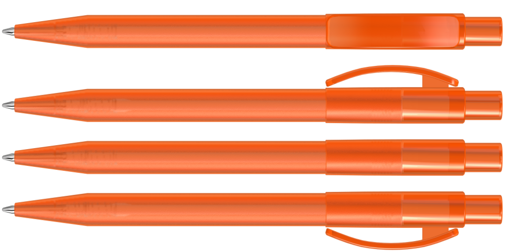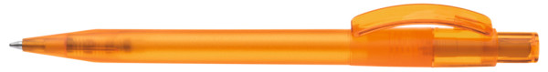 Druckkugelschreiber mit gefrostetem Gehäuse, glänzend transparentem Bogenclip und Drücker.
