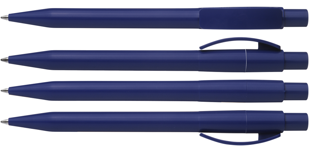 Druckkugelschreiber mit gedeckt glänzendem Gehäuse, Bogenclip und Drücker.