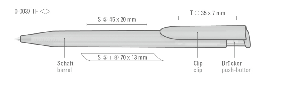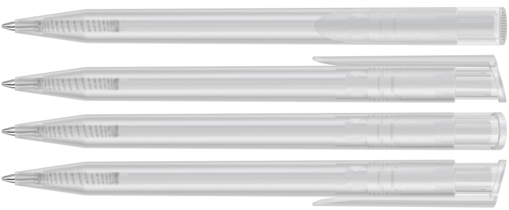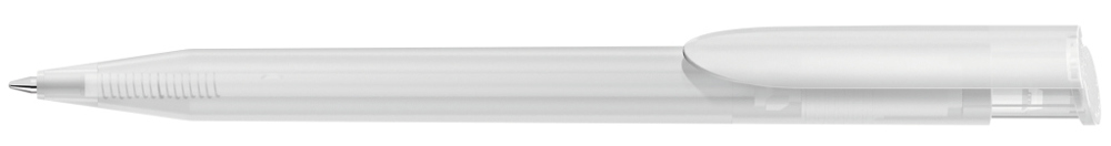 Druckkugelschreiber mit transparent gefrostetem Gehäuse und Clipdrücker.