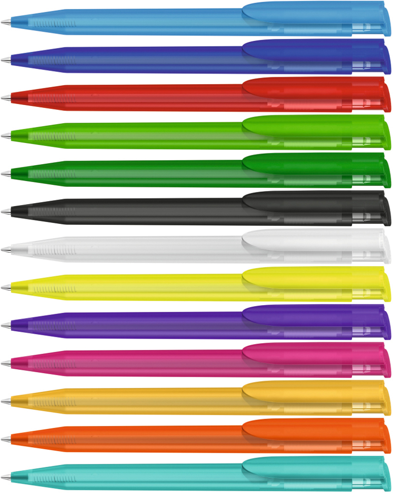 Druckkugelschreiber mit transparent gefrostetem Gehäuse und Clipdrücker. mehr