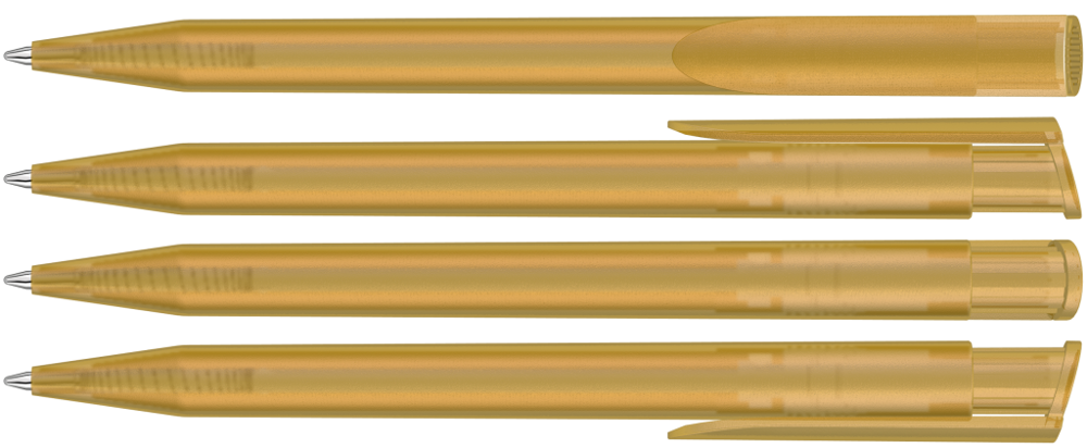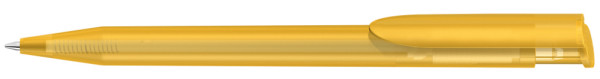 Druckkugelschreiber mit transparent gefrostetem Gehäuse und Clipdrücker.