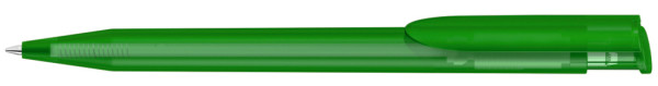 Druckkugelschreiber mit transparent gefrostetem Gehäuse und Clipdrücker.