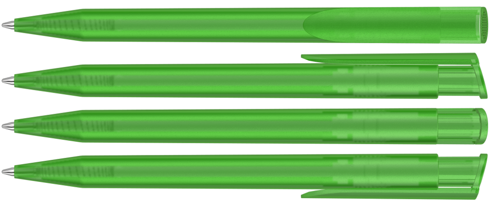 Druckkugelschreiber mit transparent gefrostetem Gehäuse und Clipdrücker.