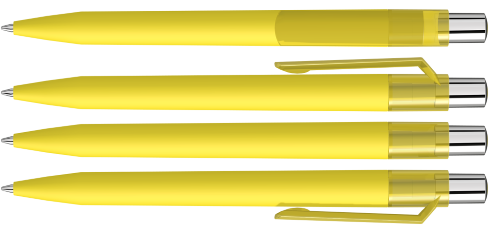 Druckkugelschreiber mit Softtouch-Schaft, transparent glänzendem Clip, silber glänzendem Drücker und farbigem Stopfen.