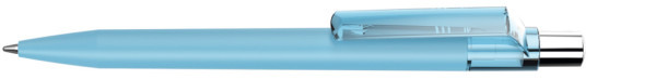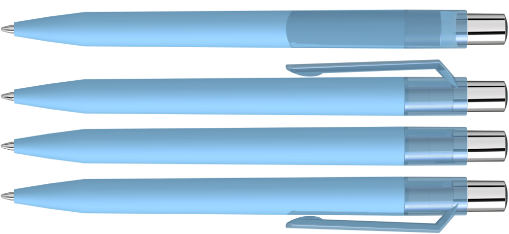 Druckkugelschreiber mit Softtouch-Schaft, transparent glänzendem Clip, silber glänzendem Drücker und farbigem Stopfen.