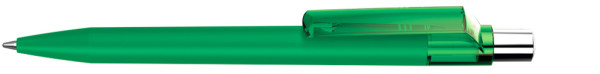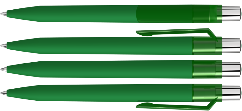 Druckkugelschreiber mit Softtouch-Schaft, transparent glänzendem Clip, silber glänzendem Drücker und farbigem Stopfen.