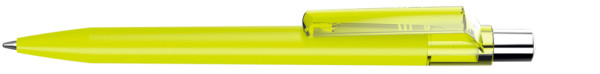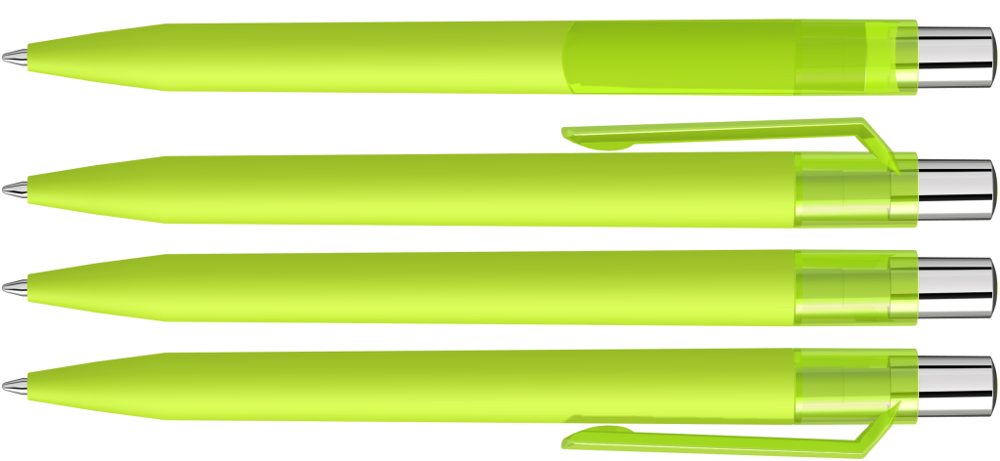 Druckkugelschreiber mit Softtouch-Schaft, transparent glänzendem Clip, silber glänzendem Drücker und farbigem Stopfen.