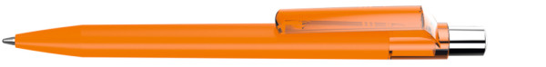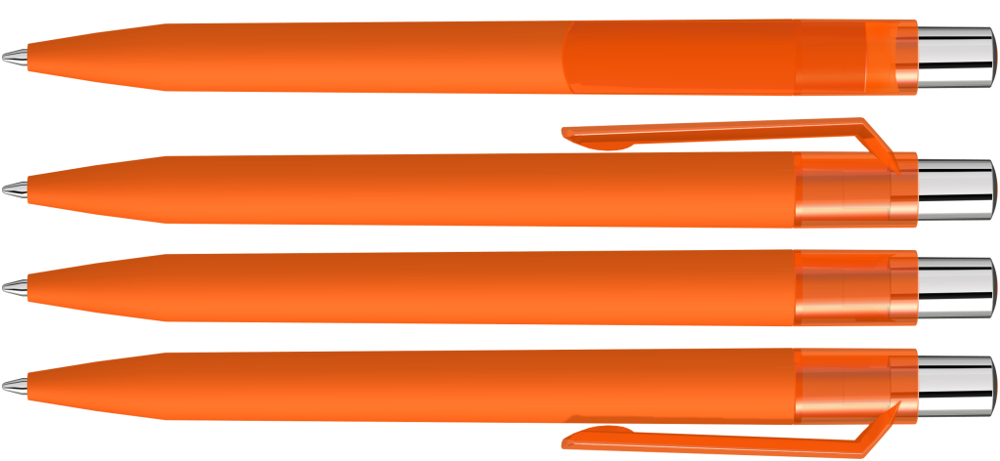 Druckkugelschreiber mit Softtouch-Schaft, transparent glänzendem Clip, silber glänzendem Drücker und farbigem Stopfen.