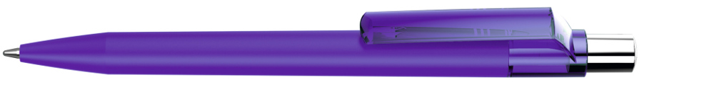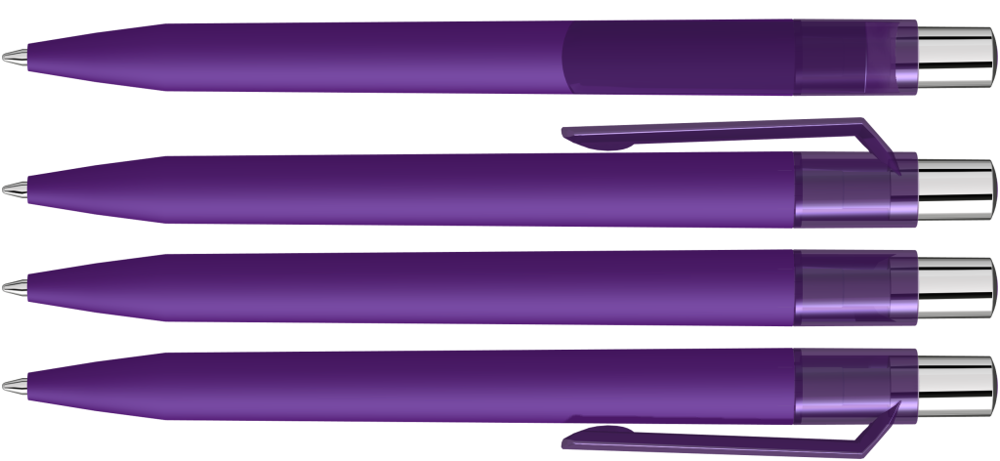 Druckkugelschreiber mit Softtouch-Schaft, transparent glänzendem Clip, silber glänzendem Drücker und farbigem Stopfen.