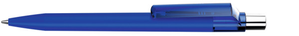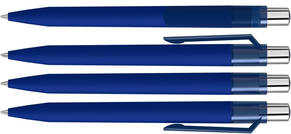 Druckkugelschreiber mit Softtouch-Schaft, transparent glänzendem Clip, silber glänzendem Drücker und farbigem Stopfen.