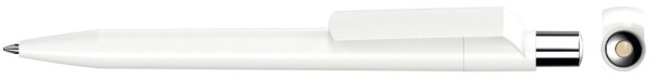 Druckkugelschreiber mit weiß gedeckt glänzendem Gehäuse, silber glänzendem Drücker und farbigem Stopfen.