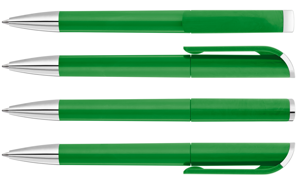 Drehkugelschreiber mit gedeckt glänzendem Gehäuse, Stopfen und Spitze glanzverchromt.