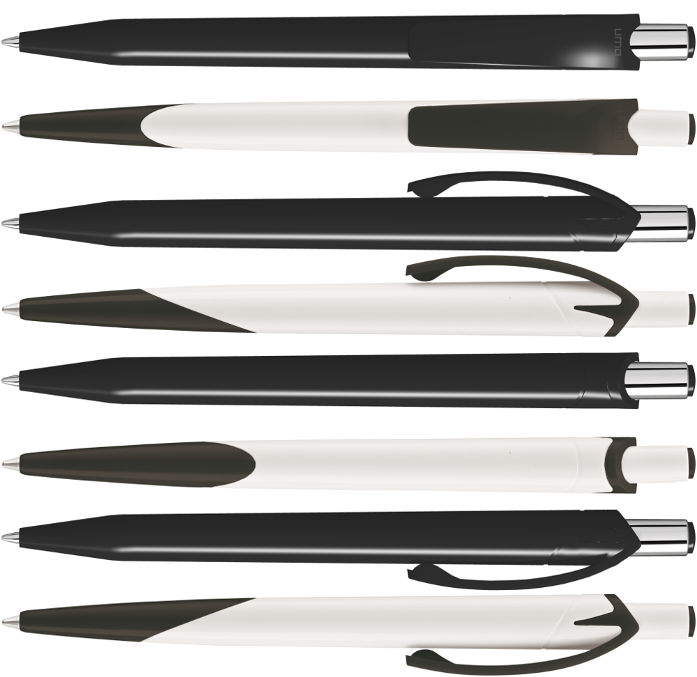 Druckkugelschreiber mit glänzend gedecktem Gehäuse und Drückerstopfen in schwarz oder weiß. Drücker in silber glänzend.