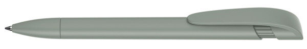 Druckkugelschreiber mit gedeckt mattem Gehäuse, breitem Bogenclipdrücker und Spitze.