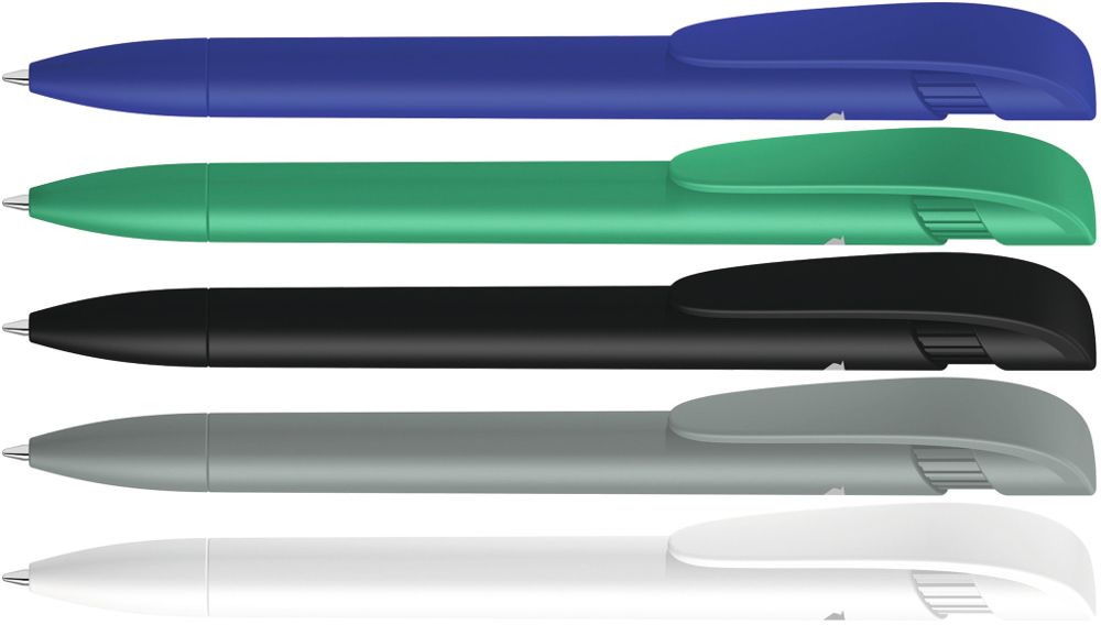 Druckkugelschreiber mit gedeckt mattem Gehäuse, breitem Bogenclipdrücker und Spitze aus recyceltem Kunststoff.