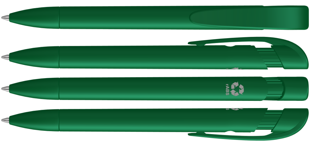 Druckkugelschreiber mit gedeckt mattem Gehäuse, breitem Bogenclipdrücker und Spitze aus recyceltem Kunststoff.