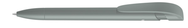 Druckkugelschreiber mit gedeckt mattem Gehäuse, breitem Bogenclipdrücker und Spitze aus recyceltem Kunststoff.