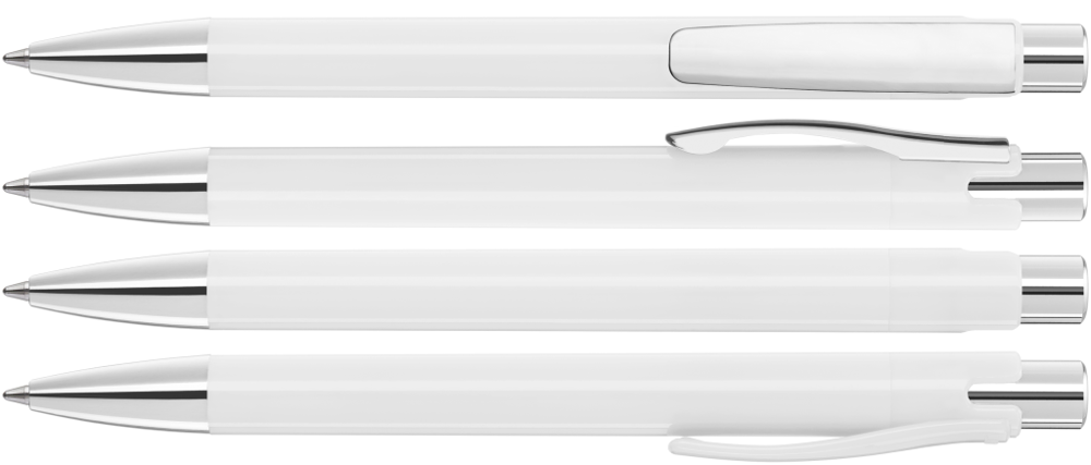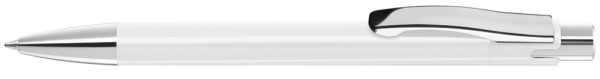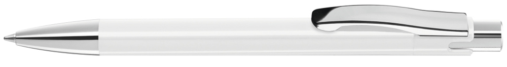 Druckkugelschreiber mit gedeckt glänzendem Gehäuse, schwerer Metallspitze, Metalldrücker und Metallclip glanzverchromt.
