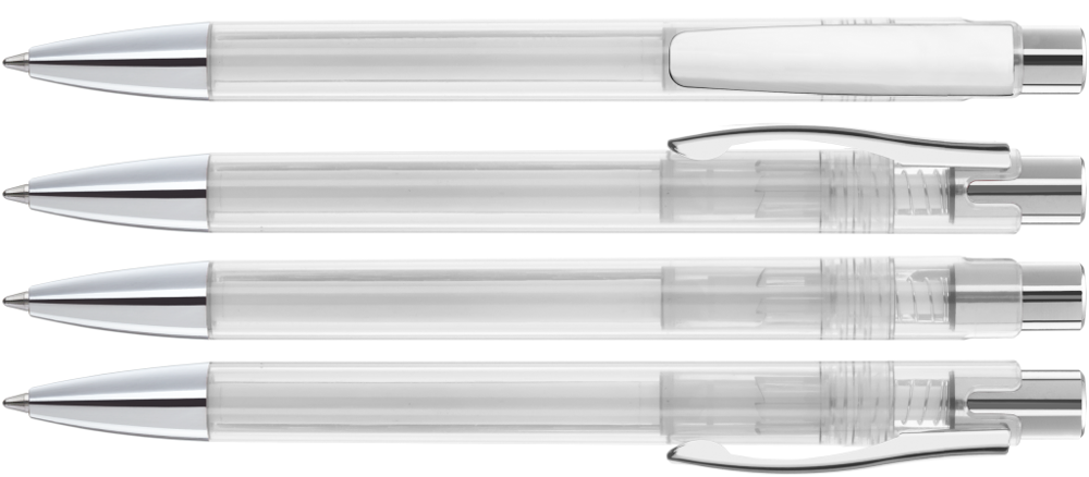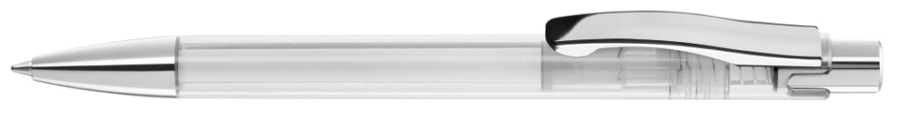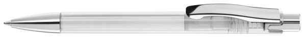 Druckkugelschreiber mit transparent glänzendem Gehäuse, schwerer Metallspitze, Metalldrücker und Metallclip glanzverchromt.