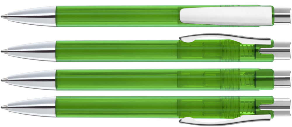 Druckkugelschreiber mit transparent glänzendem Gehäuse, schwerer Metallspitze, Metalldrücker und Metallclip glanzverchromt.